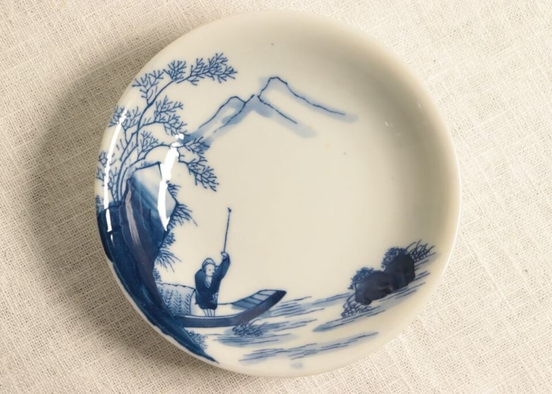 - 美術品・アンティーク・コレクション > 工芸品 > 中皿 手描染付皿京山仙人図 直径約19センチ×5枚【山水の絵柄 時代物】 明治後期~大正銅判染付山水舟上人物図小皿 | 吉祥寺PukuPuku
